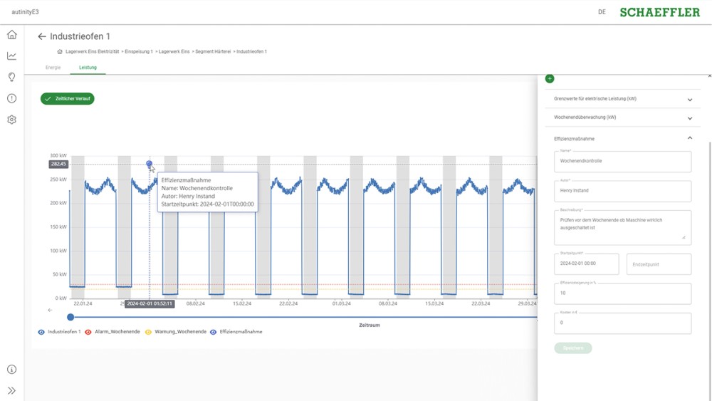 Definieren Sie Warngrenzen, um frühzeitig über mögliche Lastspitzen informiert zu werden. An die Benachrichtigungen können Sie individuelle Maßnahmenbeschreibungen knüpfen, damit jeder weiß, was zu tun ist. Das Ergebnis der Maßnahmen wird im Diagramm sichtbar gemacht.